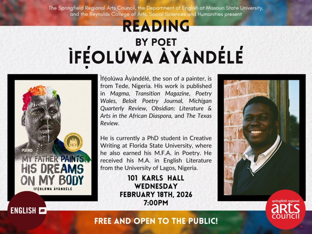 The Missouri State University English Department, the Missouri State University Judith Enyeart Reynolds College of Arts & Letters, and the Springfield Regional Arts Council welcome Ìfẹ́olúwa Ayandele to Missouri State University and Springfield, Missouri, for a reading! Ìfẹ́olúwa will be reading from his just-released Moon City Press book, My Father Paints His Dreams on My Body, winner of the 2024 Moon City Poetry Award. The reading is free and open to the public and will take place on the MSU campus in 101 Karls Hall on Wednesday, February 18, at 7 p.m. CT. Come on out and hear this amazing poet read his amazing work!