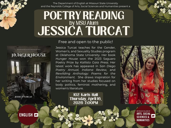 Alum Jessica Turcat is reading from her new book, Hunger House, tonight at Missouri State University! The event is at 7 p.m. in Karls 102! Come on out!